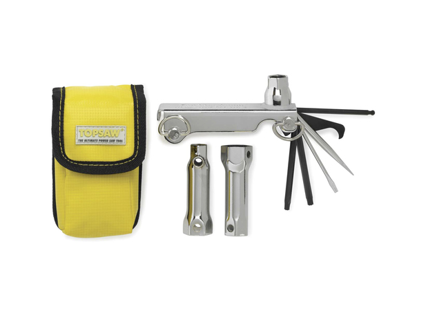 Multifunktionswerkzeug mit 12 Werkzeugen: 2 TORX T25 und T27, 4mm Kugelkopf, großer und kleiner Schraubendreher, Führungshacke, 10, 13, 16, 19, 21 mm Steckschlüsseleinsätze, Feilengriff und Nylontasche.